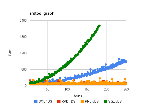 A few months ago, I started some tests with RRDTool and a data source in MySQL. At that time, I just saw that performance was awful but did not investigate further. Now is time to check why, and if any improvements could be made.